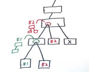 In the above diagram we see a couple of locations where different exceptions will make sense to be thrown from. The red circle represents a catch statement that handles the E2 exception and the green circle represents a catch statement that handles the E1 exception. There are a few places where we can throw an E2 exception and there are less places where we can throw an E1 exception. The X function shows us a location where we can throw no exceptions.