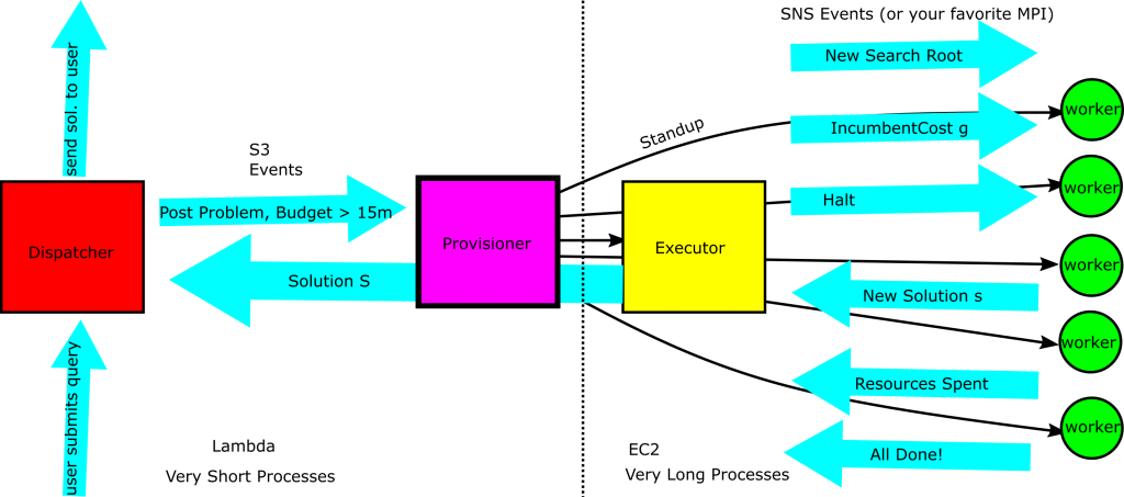 The second is that we’re using lambda for all of our compute needs here.  This isn’t a great fit, because lambda has a hard cap on how much compute time you can use on a subproblem (15 minutes as of Apr. 2019).  15 minutes is ages for many computations, but for search it’s a drop in the bucket.  Even if we’re talking about using 50 compute nodes, we’re limiting ourselves to problems that can be solved in series within about 12 hours.  That said, it is nice for the following reasons: