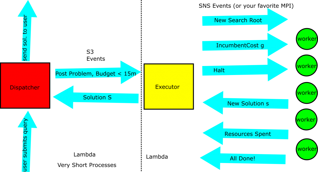 You could have a worker for every node expansion in a distributed search system.  The above is a diagram of such a system.  The kernel of the system is the rectangle in the center: an AWS lambda that handles a single node expansion.  If you’re unfamiliar with lambda, it’s Amazon’s notion of “function as a service”.  The basic idea is that if you have some function that’s stateless or effectively stateless, you can define a lambda to scale to arbitrary number of requests to process such a function.  Node expansion is roughly such a function, so long as we manage to communicate both the node to be expanded as well as the current incumbent solution to the lambda every time.