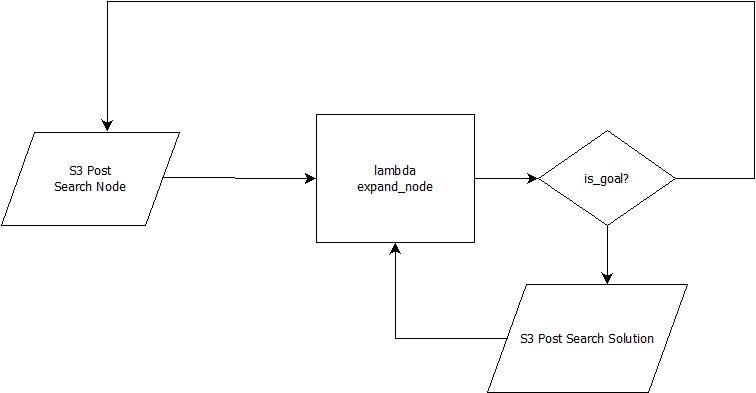 AWS Lambda places pretty tight requirements on compute time and memory consumption.  They’re meant for small parcels of work, and node expansion certainly fits the bill.  There’s also a nice alignment between how to invoke AWS lambdas and the way search proceeds in general.  Lambdas can be started in a variety of ways, one of which is based on S3 events (simple storage service).  In effect, we can use S3 as an open list for our distributed search by placing a node back to it every time expansion generates a node (the right-most decision point in the above diagram).  Lambda functions are then spun up every time a new node is published to S3.