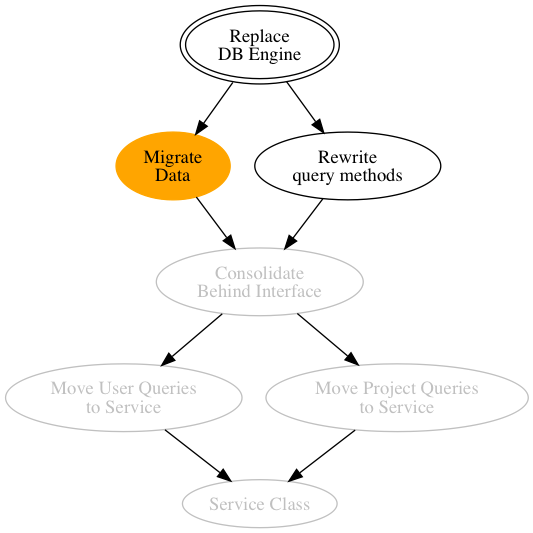 digraph G { subgraph finishedTasks { node[color=”gray”, fontcolor=”gray”]; “Service Class” “Move User Queries\nto Service” “Move Project Queries\nto Service” “Consolidate\nBehind Interface” } subgraph currentTask { node[color=”orange”, style=filled]; “Migrate\nData” } goal [peripheries=2, label=”Replace\nDB Engine”] ; goal -> “Migrate\nData” -> “Consolidate\nBehind Interface” goal -> “Rewrite\nquery methods” -> “Consolidate\nBehind Interface” “Consolidate\nBehind Interface” -> “Move User Queries\nto Service” “Consolidate\nBehind Interface” -> “Move Project Queries\nto Service” “Move User Queries\nto Service” -> “Service Class” “Move Project Queries\nto Service” -> “Service Class” }