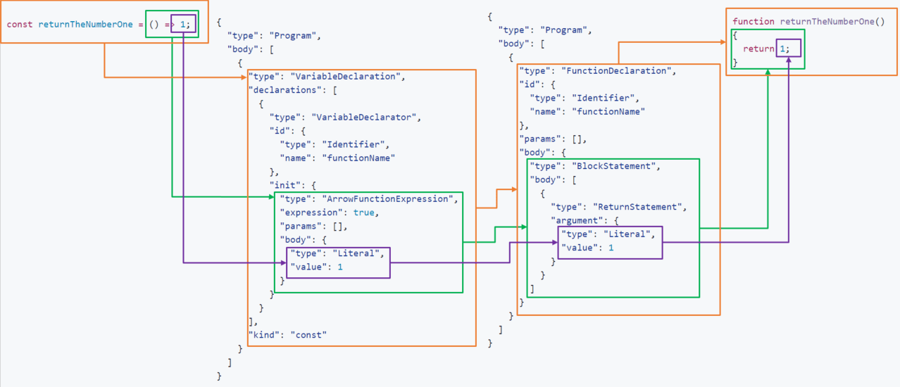 The wonderful AST Explorer will show what the AST looks like for both our input and target. I’ve marked up the ASTs from the two code snippets above to show how they are related. This should help explain what needs to be transformed and how.