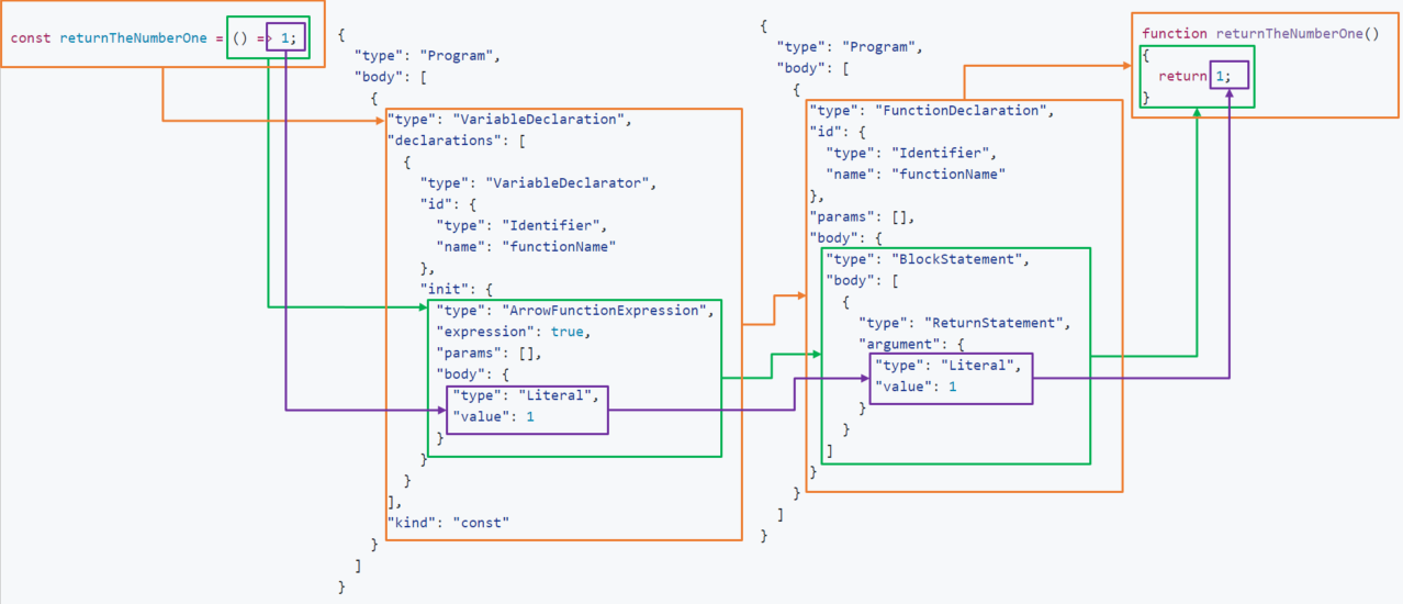 The wonderful AST Explorer will show what the AST looks like for both our input and target. I’ve marked up the ASTs from the two code snippets above to show how they are related. This should help explain what needs to be transformed and how.